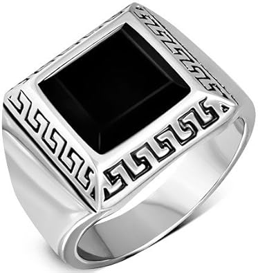 Bague Chevaliere Homme Carre Acier Et Pierre Onyx Frise Grecque Biker