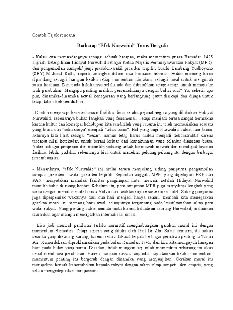 Kendati indonesia sudah puluhan tahun merdeka belum pernah masalah. Pada artikel kali ini kita akan mengetahui seperti apa contoh sebuah tajuk rencana yang ada di media cetak koran. Pengertian teks editorial tujuan struktur fungsi dan contohnya lengkap sahabat gurupendidikan pernahkah kamu mendengar istilah teks editorialkalau kamu sering membaca sebuah surat kabar misalnya majalah atau koran di dalam surat kabar tersebut biasanya banyak berita yang berisi kumpulan fakta dan informasi yang berguna buat kamu.