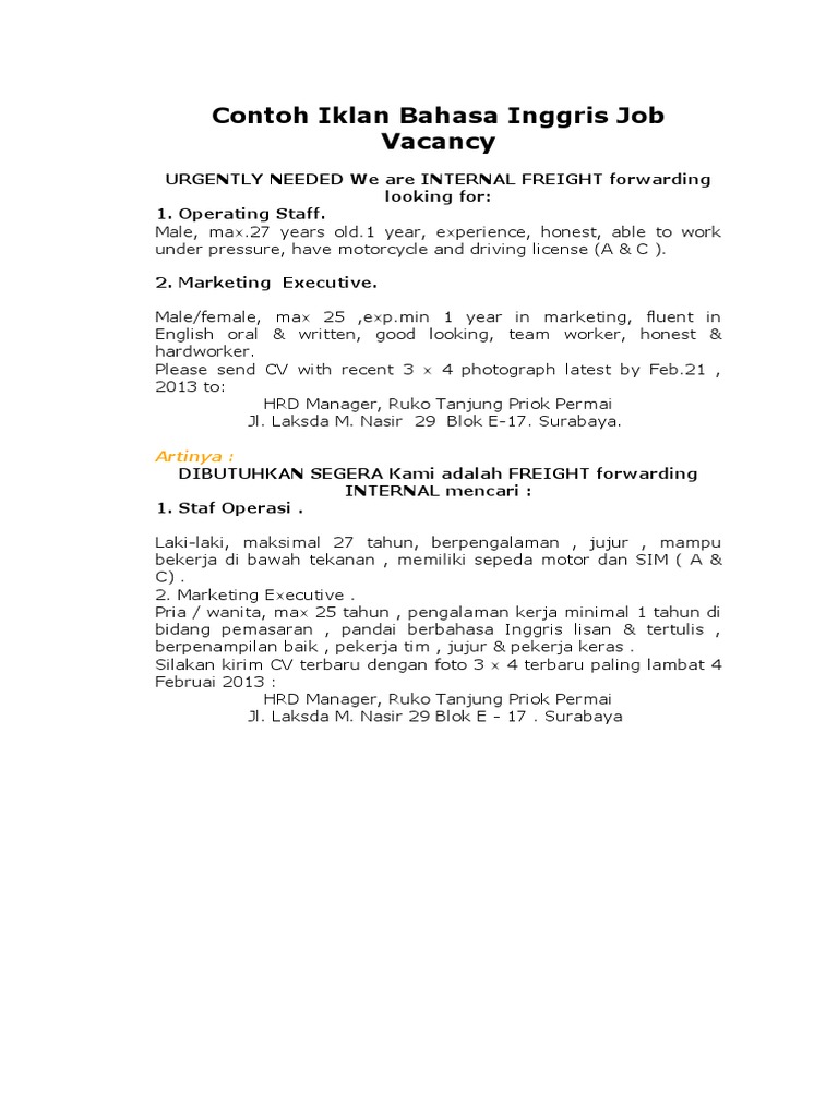Home english job vacancy dalam bahasa inggris. Contoh 1 dian institute is located in surabaya sidoarjo and kediri. Contoh job vacancy application lettercv dalam bahasa inggris.