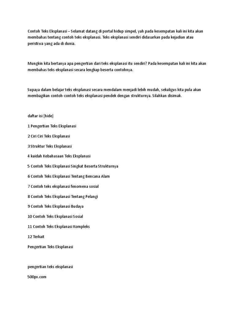 Contoh teks eksplanasi singkat. Demikianlah uraian singkat terkait pengertian teks eksplanasi ciri ciri eksplanasi struktur teks eksplanasi disertai contoh teks eksplanasi singkat beserta strukturnya diawali dari contoh teks eksplanasi sosial contoh teks eksplanasi banjir contoh teks eksplanasi peristiwa alam dan lain sebagainyaterima kasih semoga bermanfaat. Contoh teks eksplanasi singkat tentang fenomena alam. Contoh teks eksplanasi singkat top 9 fenomena alam dan sosial 2019.