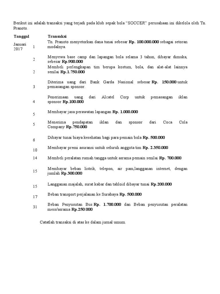 Contoh soal jurnal umum ini adalah transaksi yang terjadi pada klub. Jurnal umum adalah tempat untuk mencatat semua transaksi keuangan perusahaan pada periode tertentu secara sistematis.