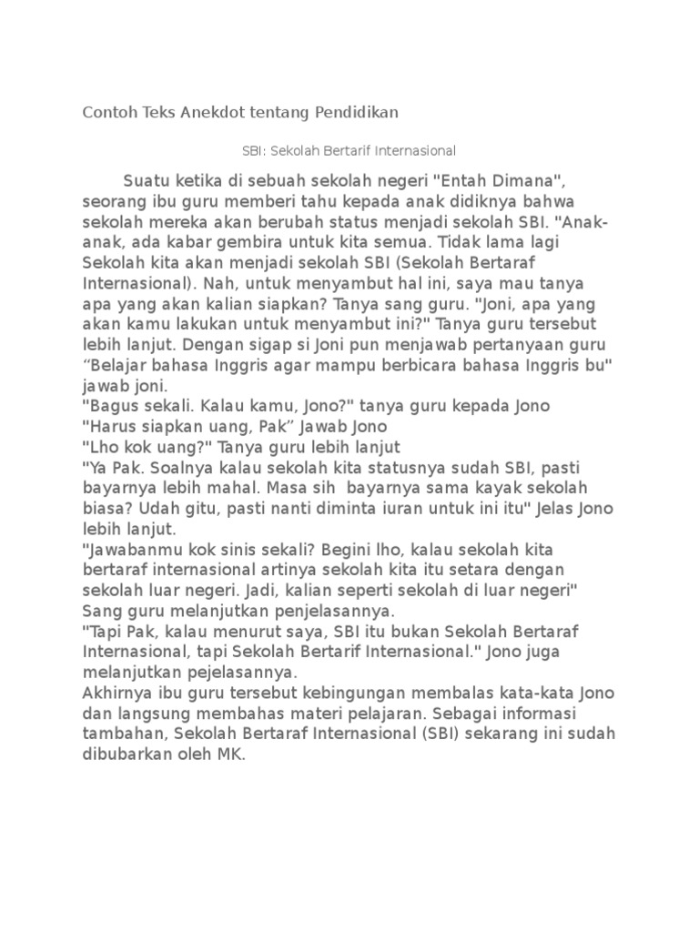 Contoh teks anekdot pendidikan. Contoh anekdot pendidikan sumber. Di sekolah dasar yang terletak di kota semarang sedang dalam kondisi istrirahat siang. Anekdot merupakan cerita singkat yang di dalamnya mengandung unsur menyindir yang bersifat lucu atau humor.